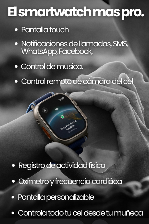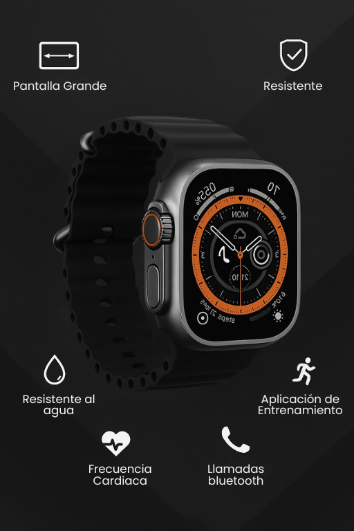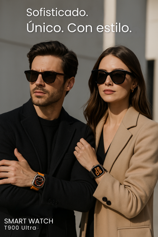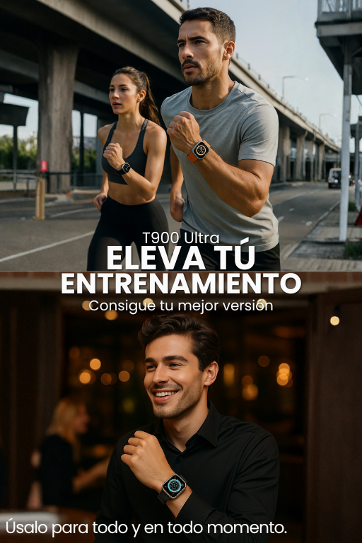El Smartwatch T900 Ultra combina diseño premium con funciones inteligentes: recibe llamadas, controla tu música, mide tu rendimiento deportivo y proyecta estatus en cada momento. Disponible en negro y naranja, es la pieza que transforma tu look y tu rutina diaria.