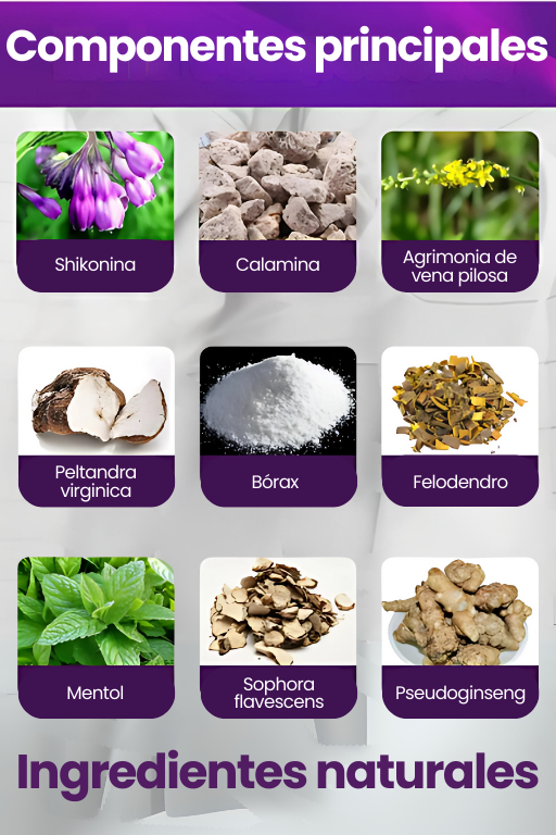 - Ingredientes activos: shikonin, calamina, mentol, seudoginseng, borax, entre otros