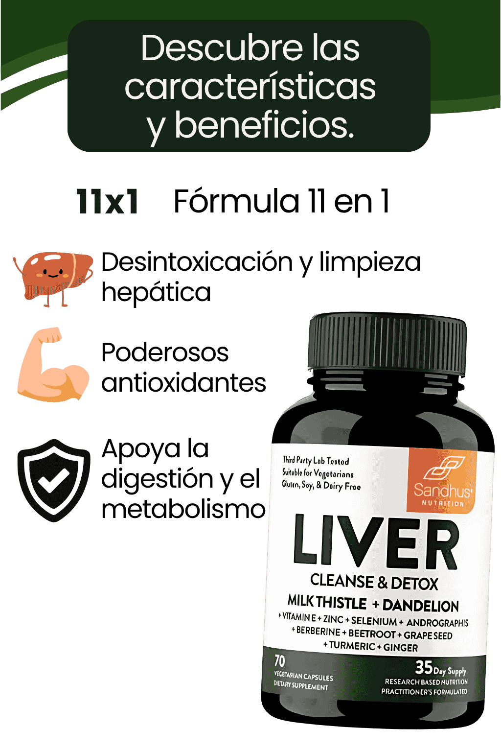 - Ingredientes clave: Cardo mariano (80% silimarina), Cúrcuma (95% curcuminoides), Raíz de jengibre, Extracto de betabel, Diente de león, Alcachofa, Zinc, Extracto de hoja de alcachofa, Extracto de raíz de bardana, Extracto de semilla de uva, Pimienta negra (95% piperina)