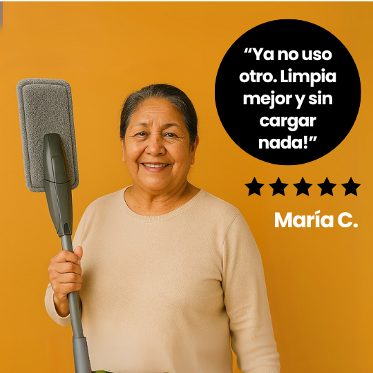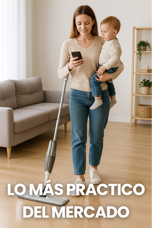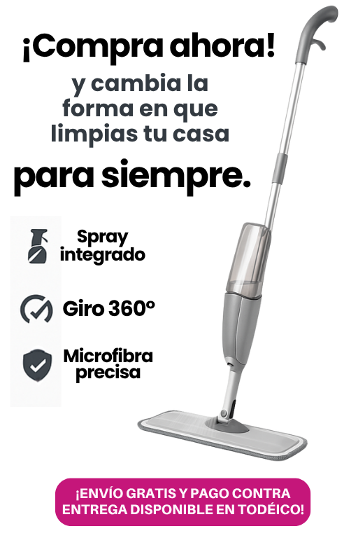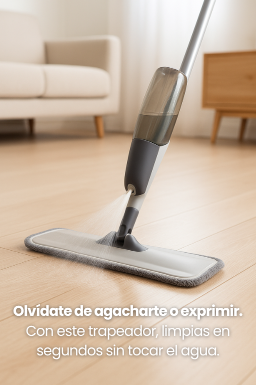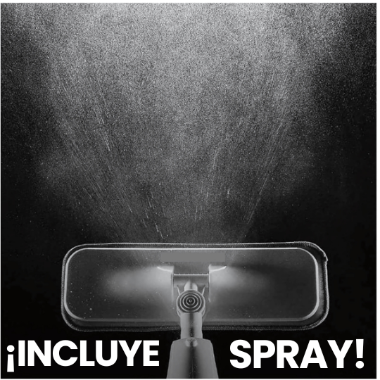 Este trapeador 360° con atomizador integrado rocía el agua justo donde la necesitas y limpia en una pasada. ¡Adiós al trapeador de antes!